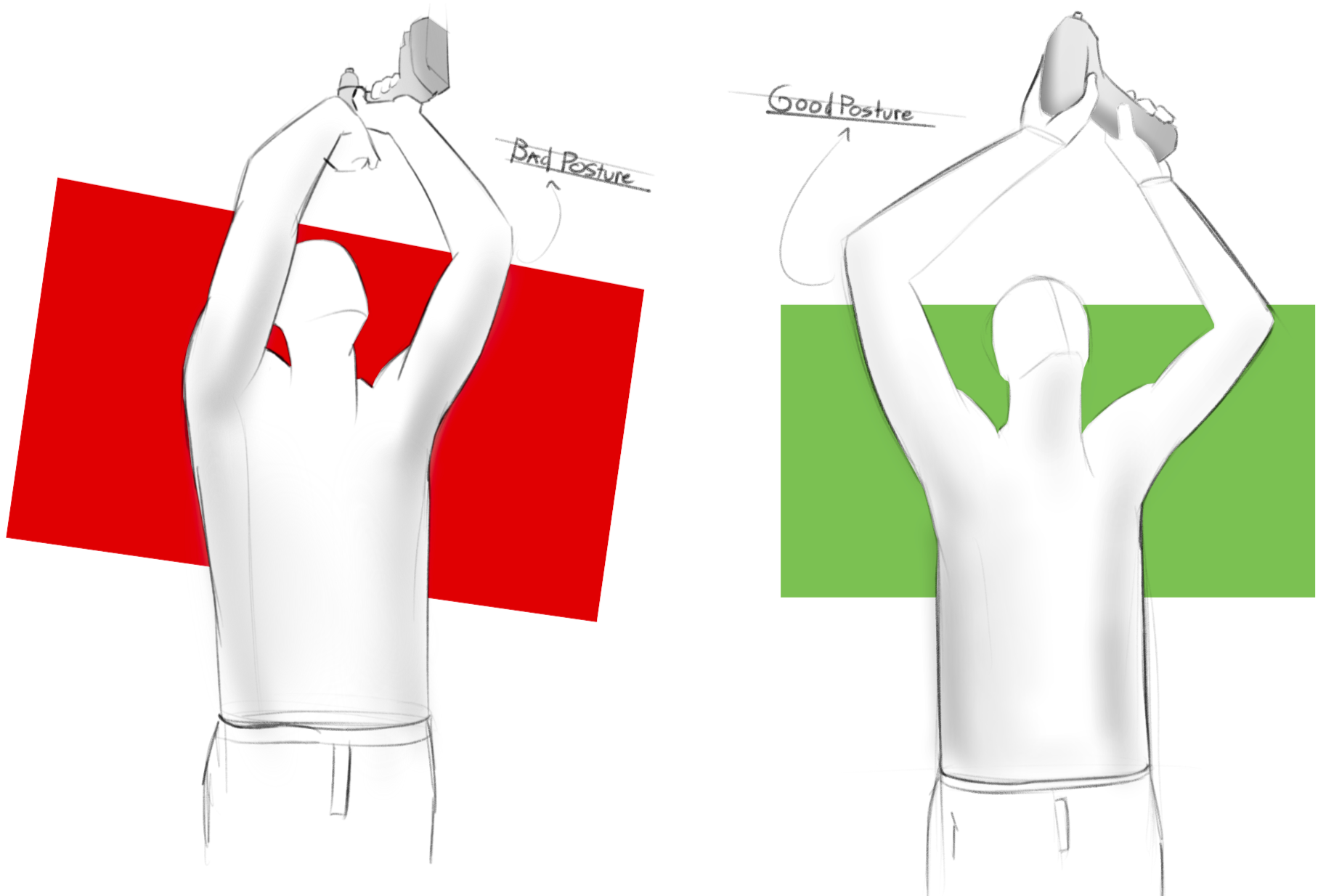 Fix users posture when holding an impact driver above the head and fix crowded hand placements on the drill.
