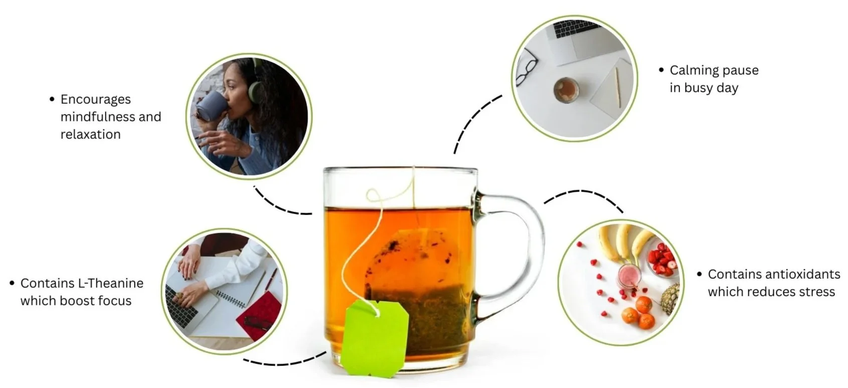 Green tea has many benefits, such as L-Theanine and antioxidants. Most importantly, the process of making green tea creates a calming pause in a stressful day.